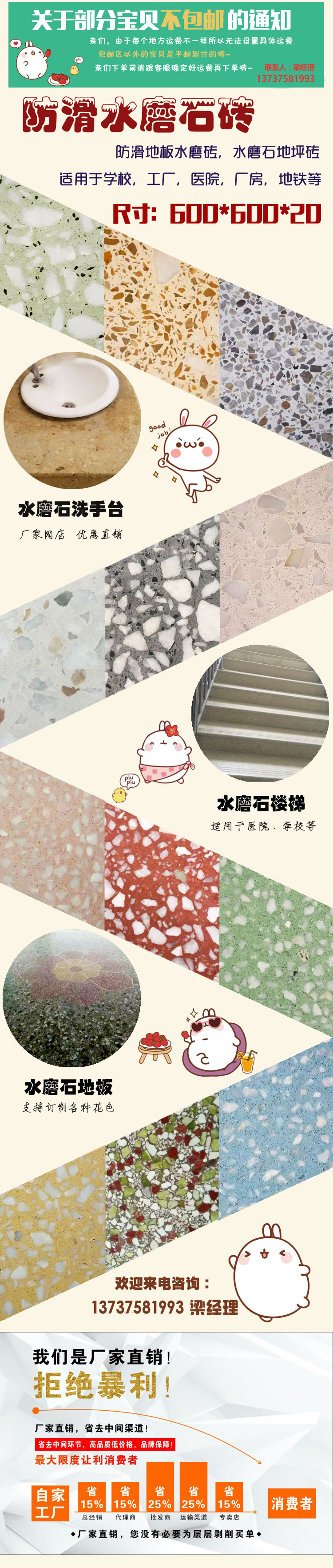 供應(yīng)水磨石制作, 預(yù)制水磨瓷磚,防滑水磨石磚, 防滑地板水磨磚,水磨石地坪磚,適用于學(xué)校,工廠,醫(yī)院,廠房,地鐵等,廠家網(wǎng)店,直銷優(yōu)惠,規(guī)格600*600*20,單價每塊25元。電話:13737581993 ? 梁經(jīng)理。歡迎來人來電代理加盟,定制顏色和款色。